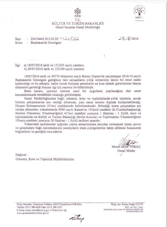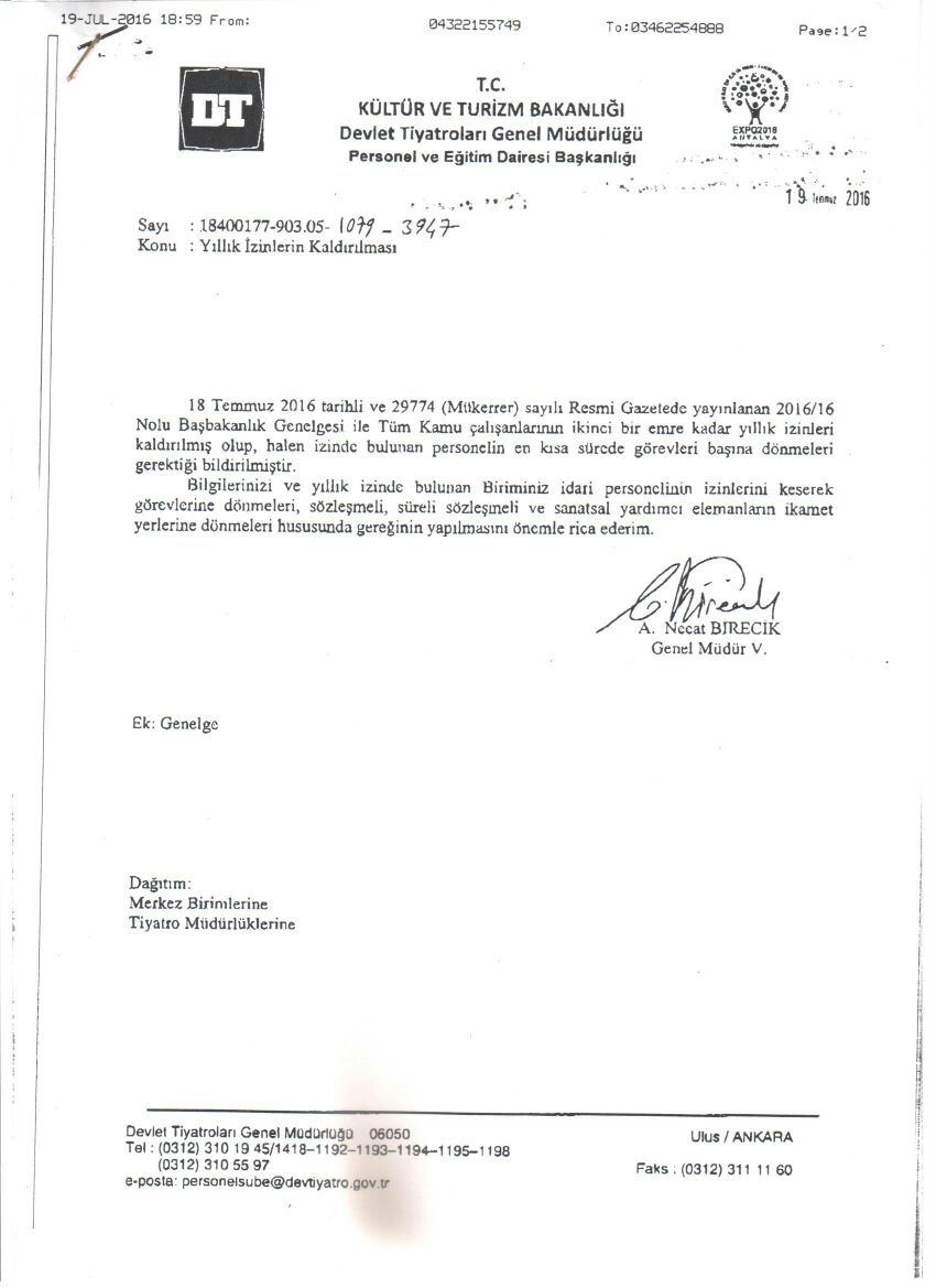 Sendikamızca, Kültür ve Turizm Bakanlığı yetkilileri ile sanat kurumlarında ,SANATÇI ve TEKNİK personel olarak çalışanlara ilişkin izinlerinin Milli Eğitim Bakanlığında öğretmenlerde ki gibi değerlendirmek ve izinlerin iptal edilmemesine yönelik birçok görüşmeler gerçekleştirilmiştir.Fakat Güzel Sanatlar Genel Müdürlüğü ve Devlet Tiyatroları Genel Müdürlüğünün konuya ilişkin yazılarından anlaşıldığı üzere izinlerin kullanımı Başbakanlığın 18/07/2016 tarih 29774 sayılı mükerrer Resmi Gazetede yayınladığı genelge ile iptal edilmiştir.