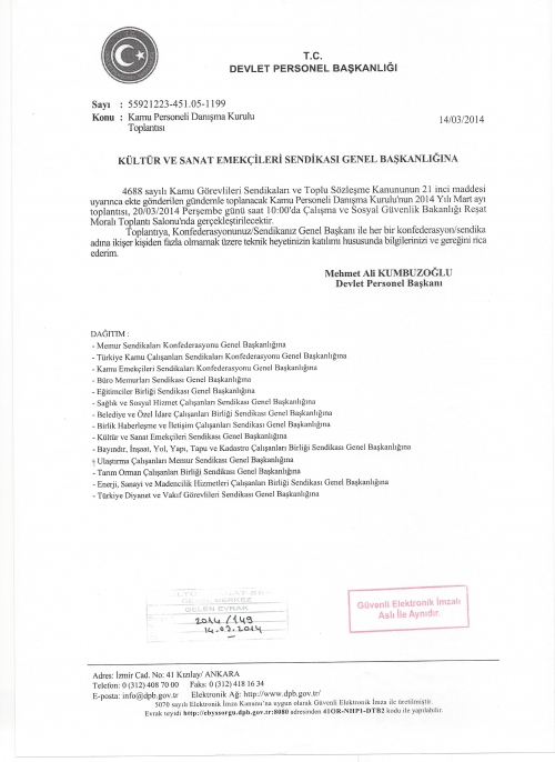 Toplu Sözleşme Görüşmeleri kapsamında; Kamu Personeli Danışma Kurulu'nun 20.03.2014 perşembe günü saat 10.00'da Çalışma ve Sosyal Güvenlik Bakanlığı Reşat Moralı Toplantı Salonunda gerçekleştirilecek 2014 yılı Mart ayı toplantısına sendikamızdan teknik heyet katılımı konusunda Devlet Personel Başkanlığı'ndan alınan yazı ekte :