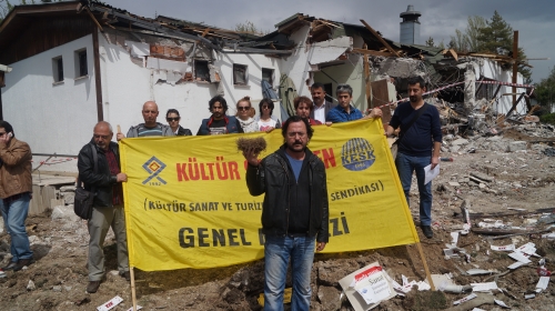 Devlet Tiyatroları’na (DT) ait İrfan Şahinbaş atölyeleri Sahnesi’nde SS İvme Yapı Kooperatifi ile DT arasında anlaşmazlığa neden olan ağaçlandırılmış alana yapılan gece yarısı operasyonuna dün sabah saatlerine bir yenisi daha eklendi. Bu defa arazide bulunan bütün yetişkin ağaçlar kesilerek Devlet Tiyatrolarının kullanımında olan yapılara kepçelerle zarar verildi. Bilindiği üzere bundan bir ay kadar önce de gece yarısında söz konusu alanda iş makineleriyle girilerek çok sayıda ağacın sökülmesi sanatçılar ve çevre dostları tarafından tepki toplamıştı. Kültür ve sanat emekçileri günler boyunca tuttukları nöbeti sürdürdüler. Yaşanan ağaç katliamı sonrasında birçok Demokratik Kitle Örgütü, park forumu ve mahalle insiyitifi temsilcileri yaşananlara tepki gösterdiler. Sözkonusu arazide mahkeme tarafından verilmiş yürütmeyi durdurma kararı olmasına, Yeni Mahalle Belediyesi tarafından bu yönde karar alınmış olmasına rağmen İvme Yapı Kooperatifi tarafından hukuk tanımaz tutuma neden engel olunamadığını anlayamıyoruz.